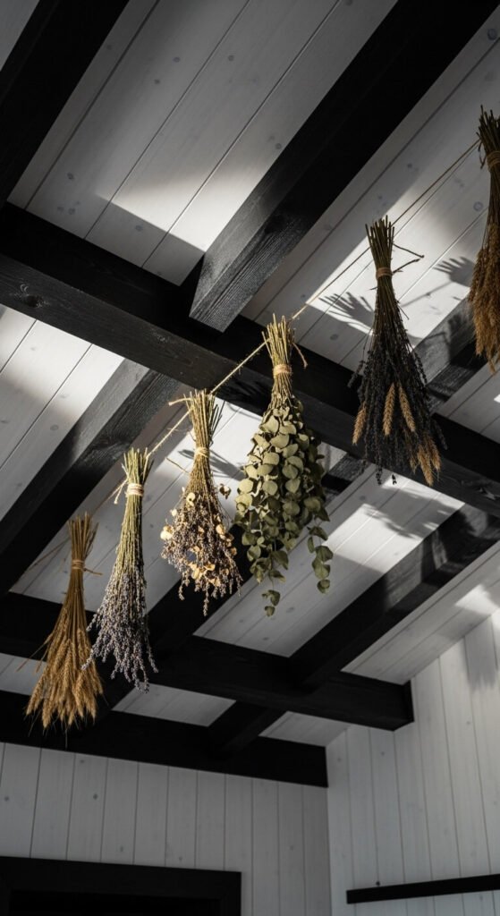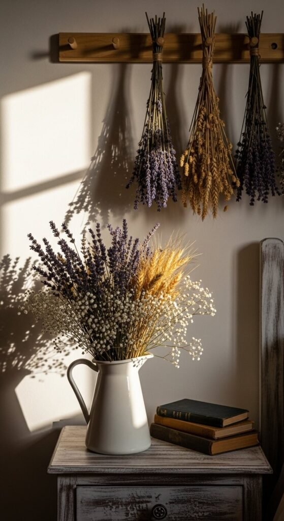 Hang lavender, wheat, or eucalyptus bundles from the ceiling or walls. Place arrangements in vintage pitchers, mason jars, or ceramic vases. Pampas grass adds height and drama.
