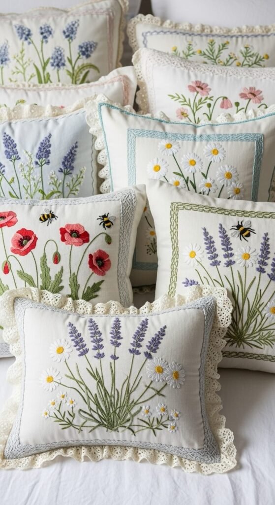 Mix embroidered pillows with plain linen ones. Look for floral motifs, bees, or simple monograms. Vintage pillowcases often feature beautiful hand embroidery.