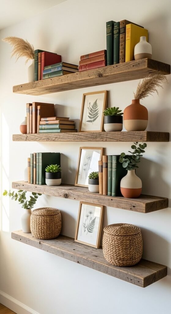 Install floating shelves in reclaimed wood or distressed finish. Display books, plants, candles, and small décor items. Keep arrangements casual and lived-in.