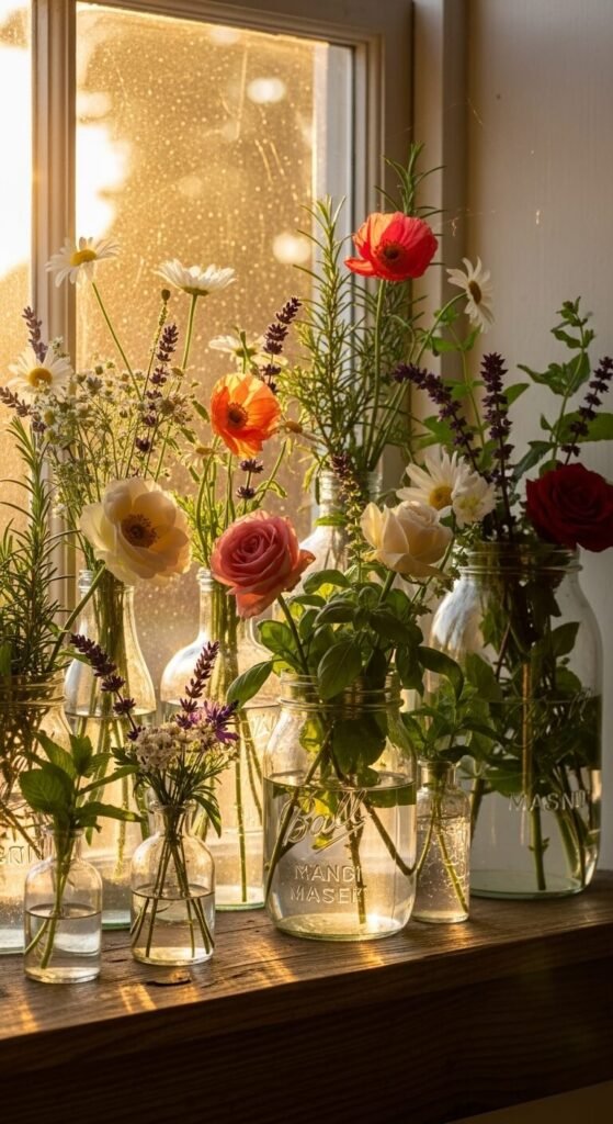 Use mason jars as vases, candle holders, or storage. Collect vintage glass bottles in different shapes and sizes. Display them empty or filled with flowers.