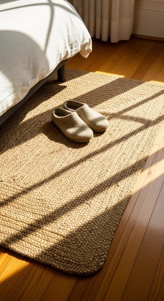Choose jute, wool, or cotton rugs in neutral tones. Braided or woven textures feel rustic. Place the rug beside your bed or layer a smaller rug over a larger one.