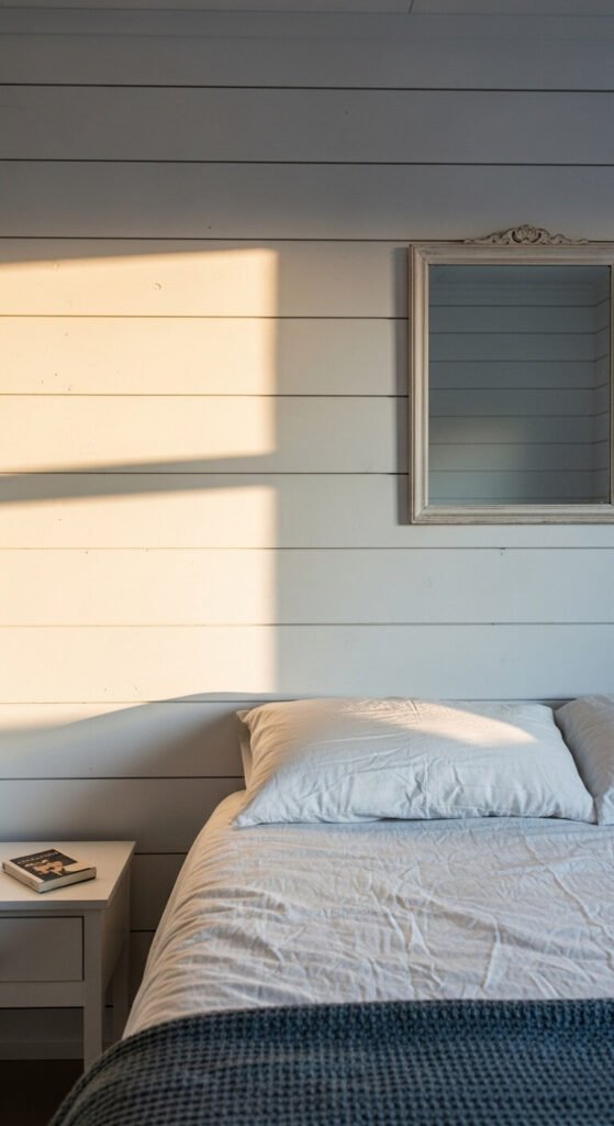 DIY-friendly: Paint existing walls white, then add decorative wood strips spaced evenly to create faux shiplap. Strips cost $20-40 at hardware stores. You’ll get the look without major construction. One accent wall makes enough impact.