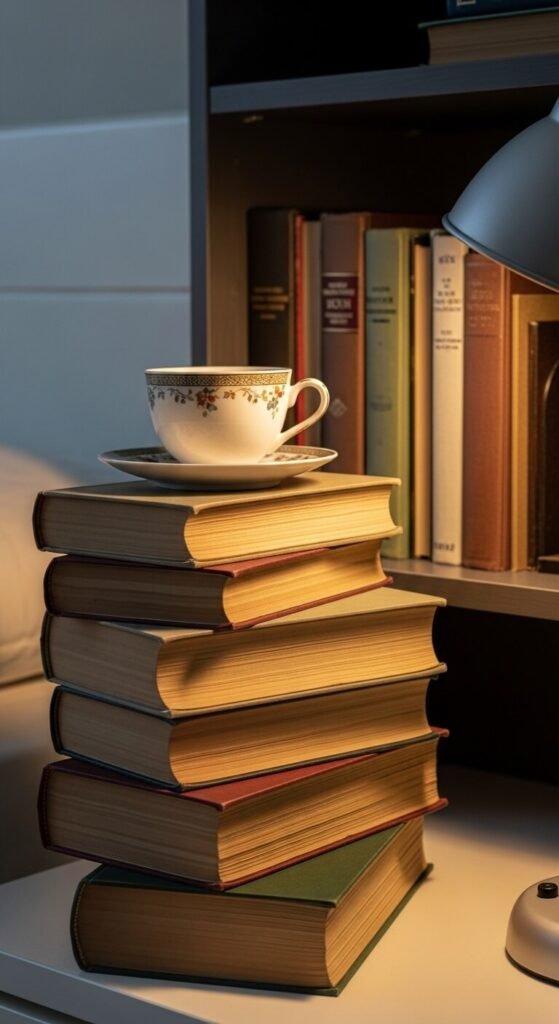 Stack books on nightstands, dressers, or shelves. Choose covers in muted colors—cream, sage, burgundy, tan. Mix vertical and horizontal arrangements.