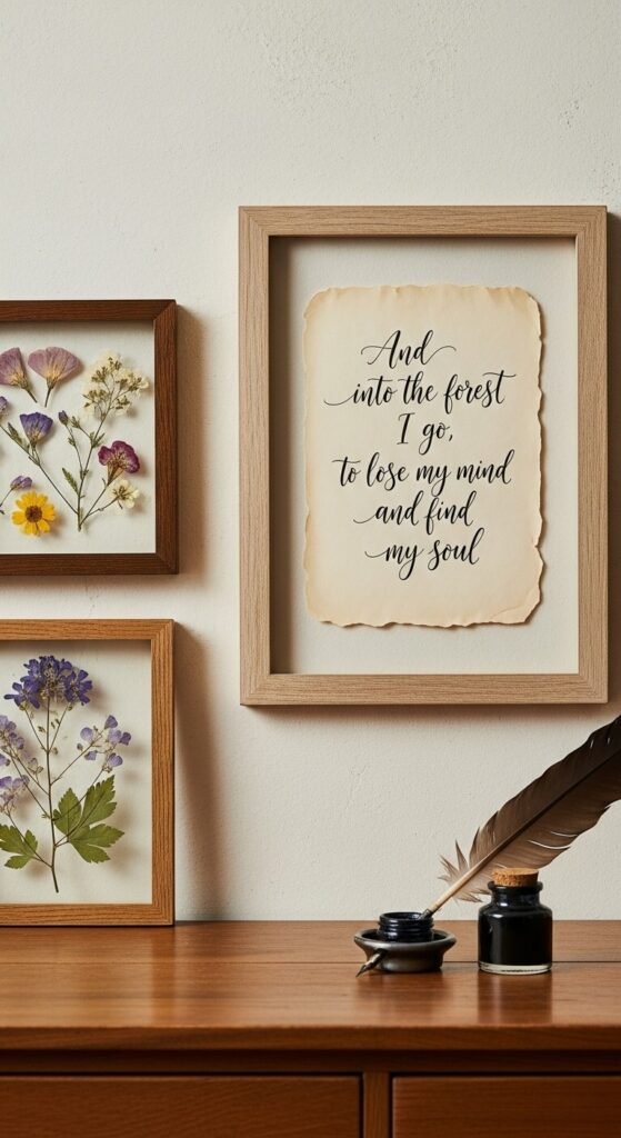 Frame favorite quotes, poems, or pressed flowers with handwritten labels. Use calligraphy or your own handwriting. Imperfections add charm.