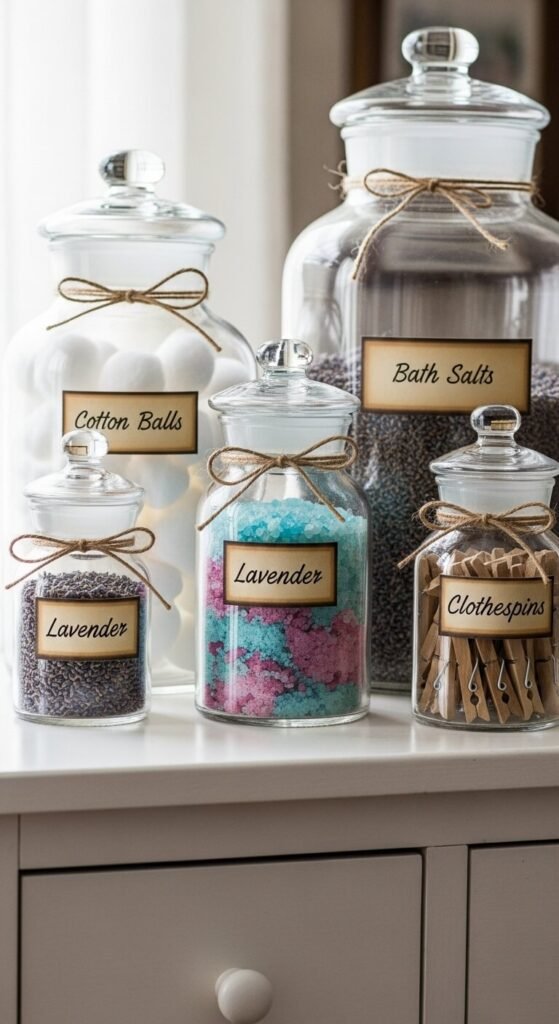 Shopping smart: Buy jars at thrift stores for $1-3 each. Dollar Tree sells smaller glass containers. Use jars you already have from food. Add burlap or twine around lids for cottage detail. They turn clutter into charming displays.