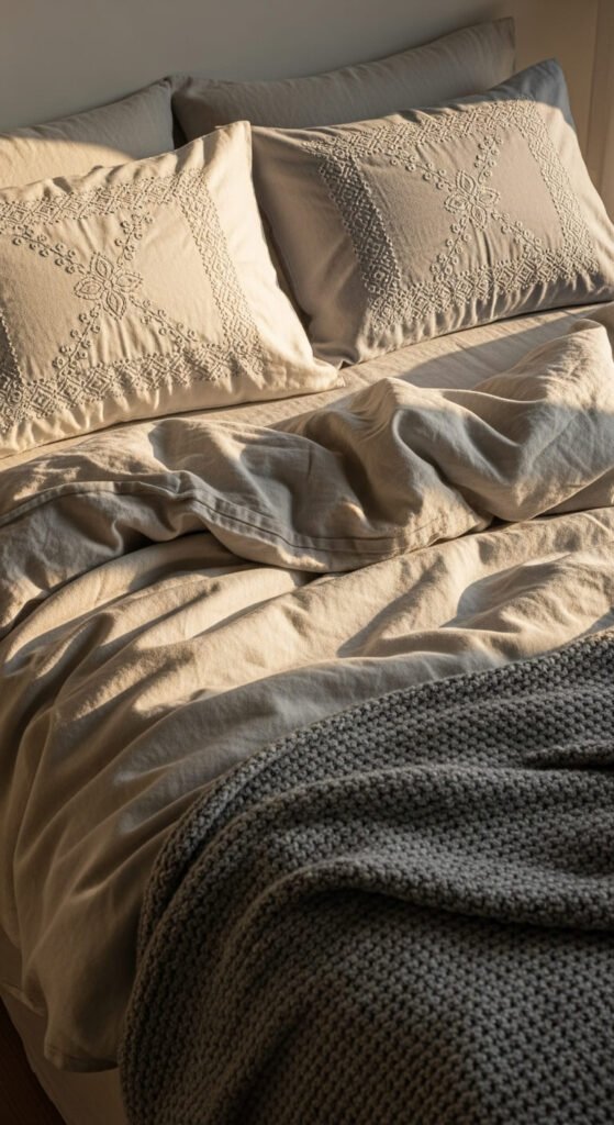 Skip the perfectly pressed hotel look. Let your linen sheets bunch and crease naturally. Mix different neutral tones—cream, beige, white, soft gray—for depth.