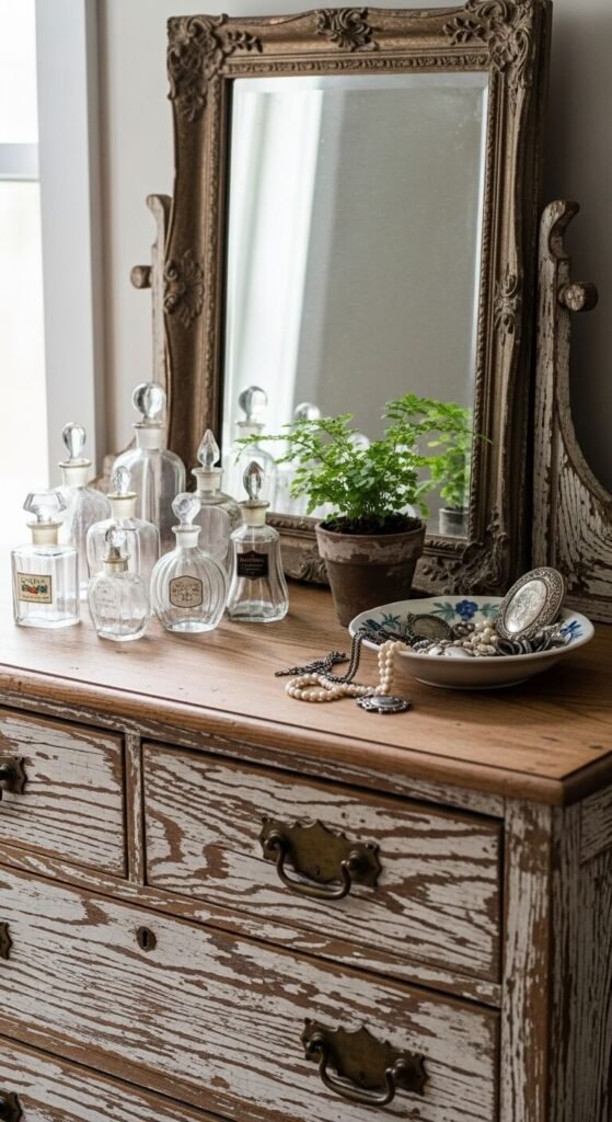 Leave the natural patina or lightly sand and stain for a refreshed look. Mismatched wood tones actually enhance the cottagecore vibe. Money saver: A $40 thrift store dresser beats a $300 new one every time. Paint handles with chalk paint for a quick update.