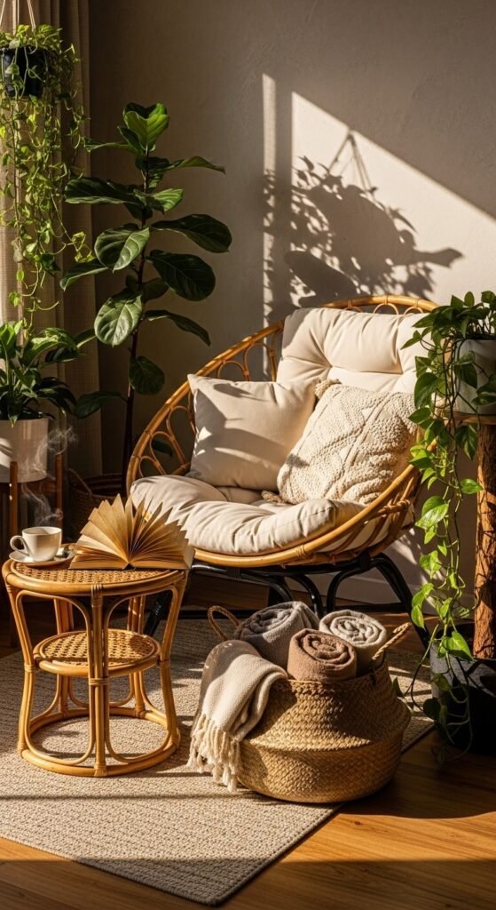 Wicker baskets and rattan furniture bring natural texture. These materials feel organic and handmade.
