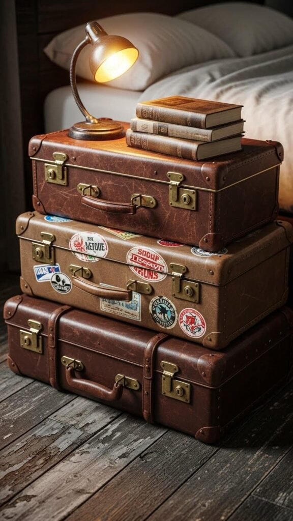 Old suitcases solve storage while adding character. Stack two or three as a nightstand alternative. Store off-season clothes, extra blankets, or keepsakes inside.