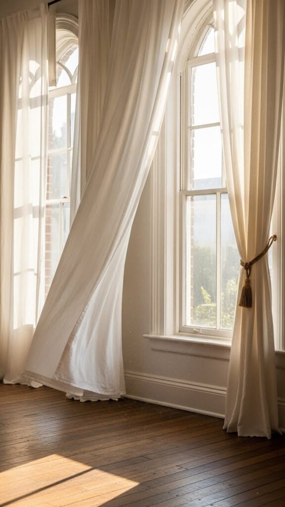You can make simple rod-pocket curtains with basic sewing skills or use clip rings for a no-sew option. Leave them open during the day to maximize natural light. The gentle movement creates a peaceful, breathing quality in your room.