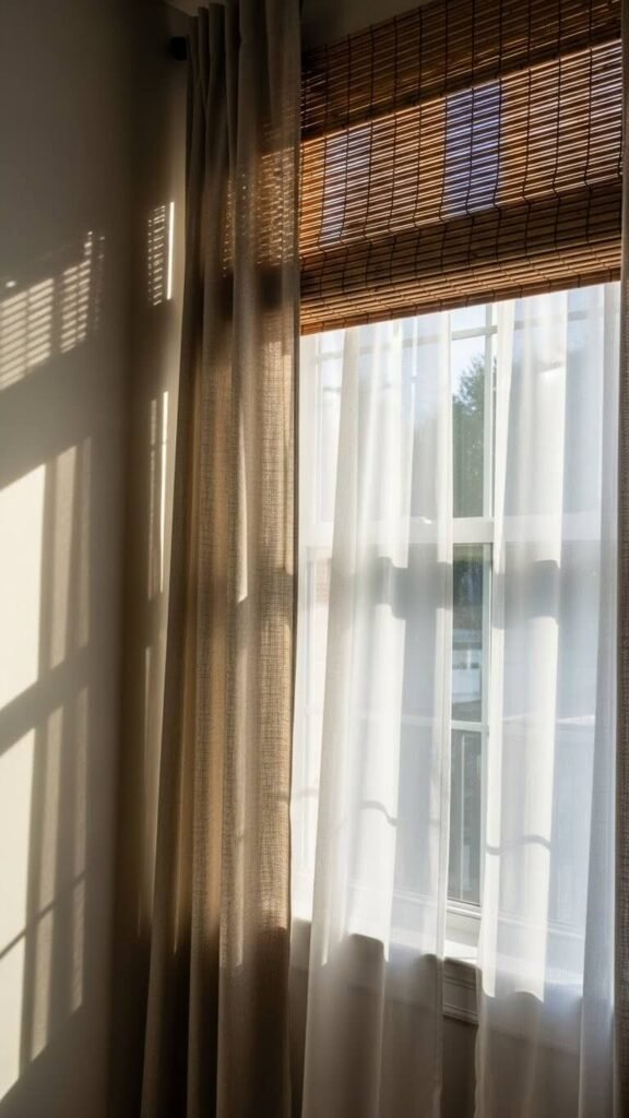 Combining different window treatments creates richness and control over light. Start with sheer curtains closest to the glass. Add heavier linen or cotton panels on top for privacy and darkness.
