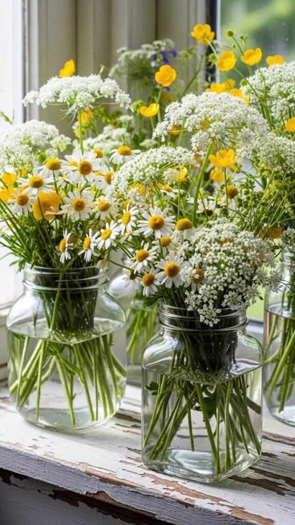 Fresh flowers don’t require expensive vases. Collect mason jars, old milk bottles, or vintage glass containers. Fill them with whatever’s blooming—even dandelions and clover look charming.