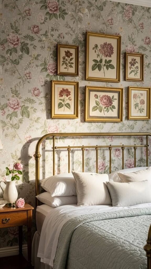 If wallpaper feels too permanent, try painting one wall a soft sage, dusty pink, or cream color. Add botanical prints in mismatched frames above your bed. The goal is creating a focal point that draws the eye without demanding attention.