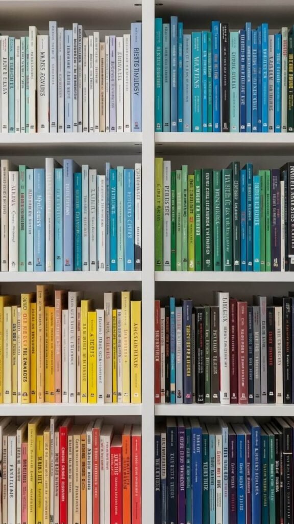 Organize by color for a calmer look. Remove dust jackets to reveal uniform cloth covers.