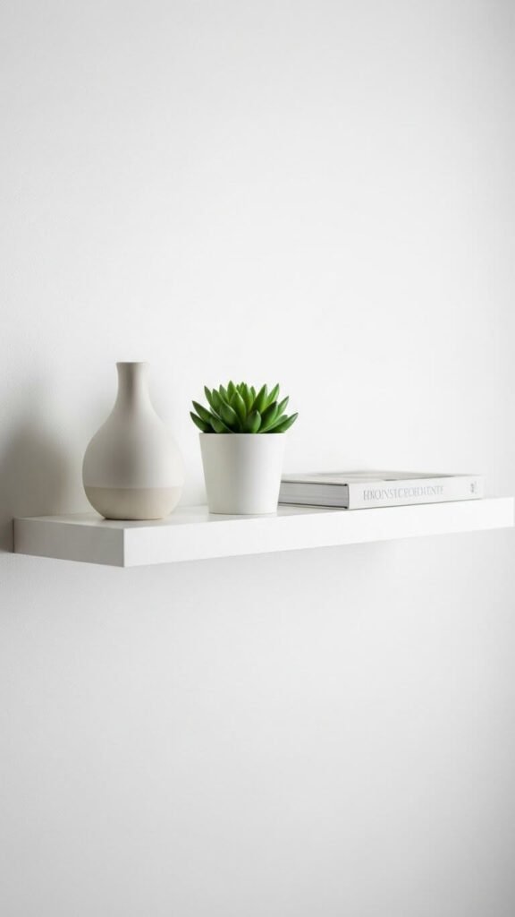 Mount two or three floating shelves instead of a bulky bookcase. White or light wood works best.