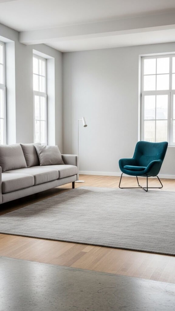Skip area rugs or use one small rug only under the coffee table. Bare floors make rooms look twice as big.