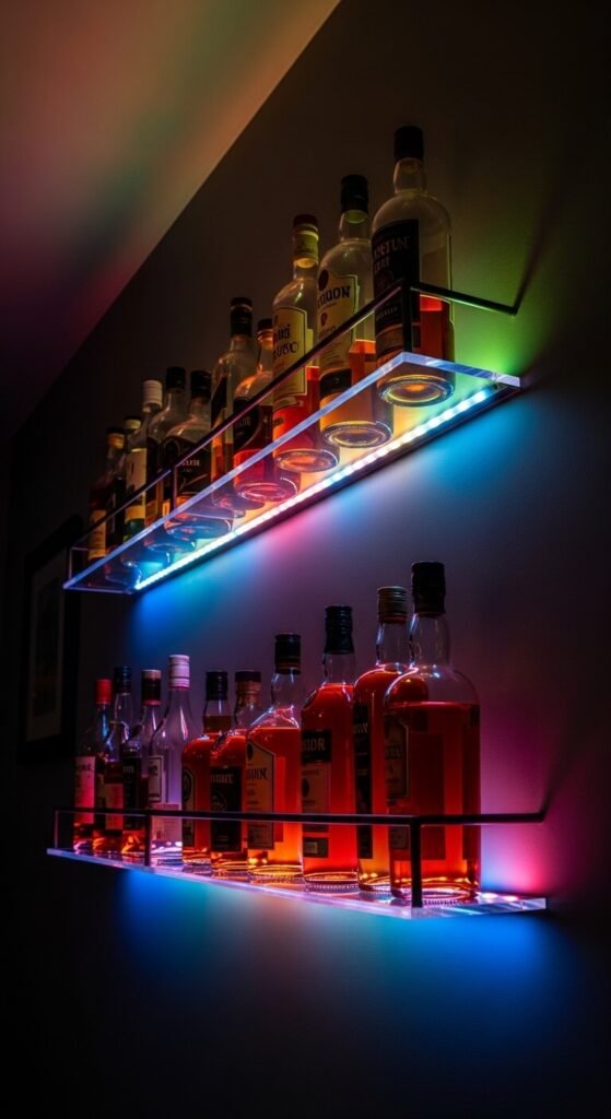 Light and glass are a magical combination. Install LED strips underneath a liquor or bar shelf and let the light filter through your bottles. The colors that come through translucent glass look stunning without any extra effort. Deep amber, red, or warm orange strips work best for this. A smart controller lets you change colors for different moods or occasions. This project takes less than 15 minutes and costs around $12–$18 for the strips alone.