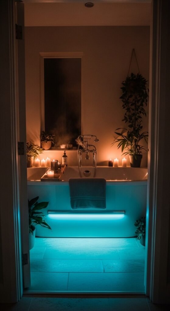 Turn bath time into an actual experience. Waterproof LED strips (IP67 or IP68 rated) can be mounted along the outer base of your bathtub. Choose a deep blue or soft green for a spa atmosphere. Soft warm white mimics candlelight without the fire risk. Mount the strip facing the floor so the light creates a gentle glow under the tub. Pair with a remote control so you can adjust the color from inside the tub. Budget: around $15–$25 for waterproof kits.
