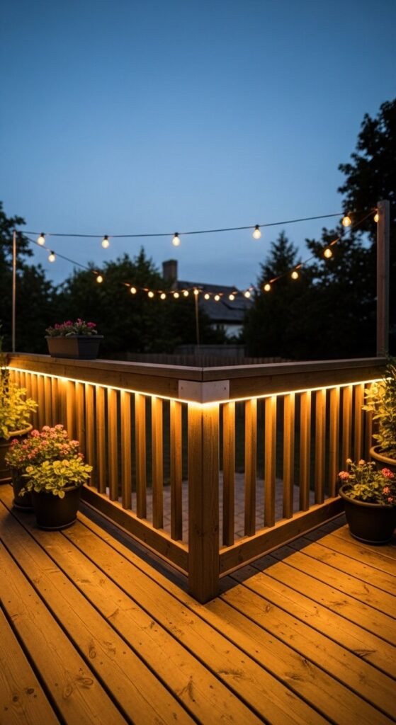 Outdoor LED strips rated IP65 or higher handle rain and humidity. Mount them along the top cap of your deck railing for a warm, welcoming glow. Or run the strip along the base of the railing to light the deck floor beneath. Warm white or amber looks the most natural outdoors. Solar-powered LED strip kits are also available if outlets are far away. This is a great weekend project that makes evening outdoor time significantly more enjoyable.