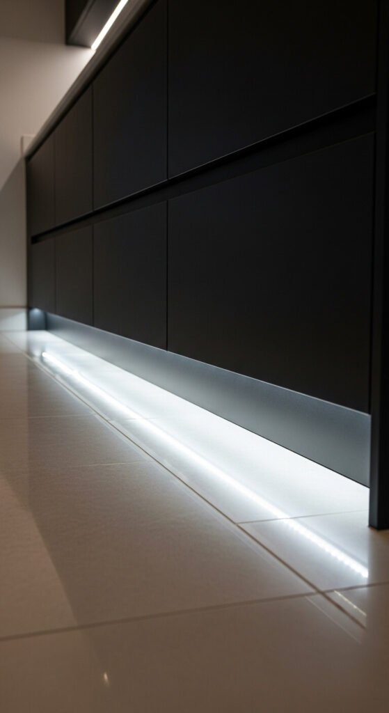 This is one of the most designer-looking LED tricks in the kitchen. Toe kick lighting runs along the recessed space at the base of your lower cabinets. It makes the cabinets look like they’re floating above the floor. It’s also a practical nightlight for late-night kitchen trips. Warm white works in most kitchens. The toe kick channel hides the strip completely — you only see the glow. This is a low-cost upgrade (under $20) with a very high visual payoff.