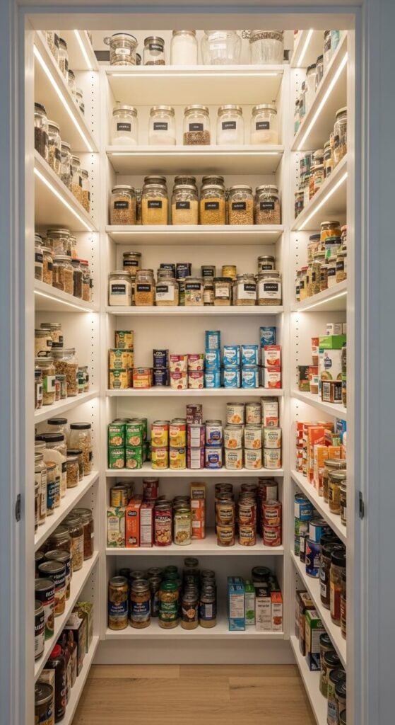 A dark pantry makes grocery organization impossible. LED strips along pantry shelf edges fix that immediately. Bright white (5000K) gives you the clearest visibility. Motion-activated strips work brilliantly here — the light comes on the moment you open the pantry door. Use the adhesive backing to stick the strip along the underside of each shelf. A battery-powered kit removes the need for nearby outlets entirely. One roll of strip lights usually covers 2–3 full shelves.