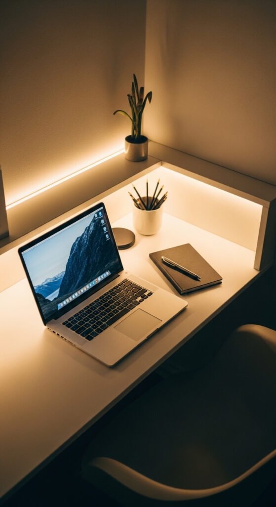 Back-of-desk lighting is a subtle touch that makes your home office feel intentional. Stick a strip along the wall-facing edge of a floating or wall-mounted desk. The glow hits the wall and bounces back softly, reducing screen glare. Choose warm white for a focused-but-relaxed work atmosphere. Daylight white (5000K) is better if you do detail-heavy work. This is a simple peel-and-stick project that costs around $10–$15 and takes under 10 minutes to install.