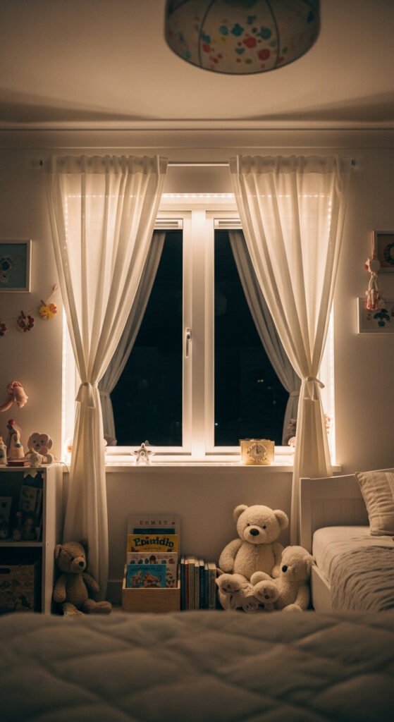 Soft LED lighting works beautifully in kids’ rooms as a nightlight alternative. Frame the window with a warm white or soft yellow strip. It creates a glowing frame that’s comforting at night and decorative during the day. Keep brightness low and avoid blue-heavy colors, which can interfere with sleep. A dimmable smart strip lets you reduce brightness at bedtime. Use only low-voltage, safe-rated indoor strips around children’s spaces and always keep cords out of reach.