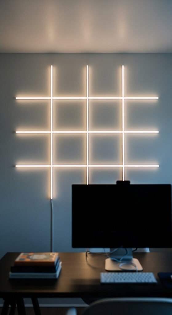 Your background during video calls matters. A glowing accent wall behind your desk immediately upgrades your on-screen look. Use LED strips to create geometric shapes or frame the wall in a U or rectangle pattern. Color-changing strips let you shift the mood — warm for client calls, bold colors for casual Zoom hangouts. This is also popular in content creator and podcast setups. Many creators spend under $30 total creating a professional-looking lighted studio wall backdrop.