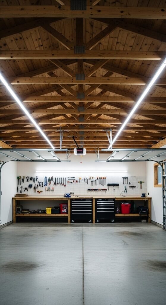 Garage lighting is often overlooked. Overhead LED strips on ceiling beams give even, shadow-free light across your workspace. Bright daylight white (6000K–6500K) is best for garages and workshops — it closely resembles natural light. Stick strips to the flat underside of each beam. For best results, run strips in parallel rows to eliminate dark zones between beams. Battery-powered strips work for garages without ceiling outlets. Total cost for a two-car garage can be under $40.