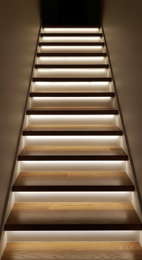 Stair lighting does two things at once — it looks stunning and prevents nighttime trips. LED strips along stair edges act like a runway at night. You don’t need smart lights for this. A simple motion sensor plug and a warm white strip work perfectly. Stick the strip to the underside lip of each step so the light points downward. This hides the strip and softens the glow. Budget option: a full staircase set can cost as little as $25.