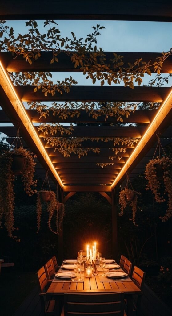 Outdoor entertaining spaces become magical with good lighting. Use weatherproof LED strips along the inner faces of pergola beams. Warm amber (2200K–2700K) mimics firelight and feels the most inviting outdoors at night. You can run the strip along just the top beams to create a soft canopy of light overhead. Solar-powered strip kits are an option if your pergola is far from a power outlet. This upgrade costs $20–$50 depending on pergola size.