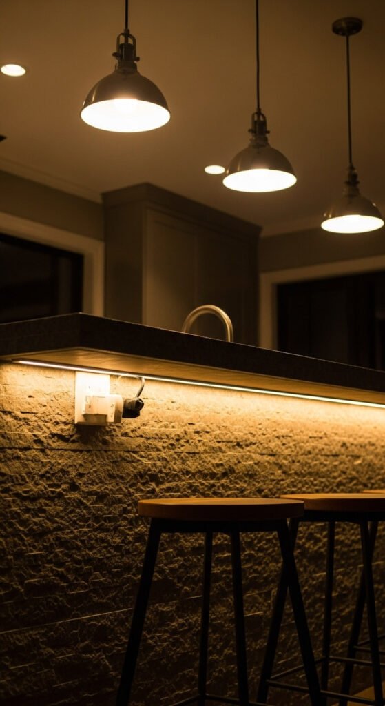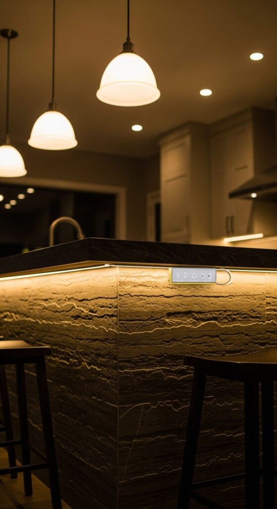The underside of a kitchen island overhang is a hidden gem for accent lighting. A warm LED strip mounted along the inner edge of the overhang casts a downward glow onto the seating area below. It creates a restaurant-style feel at home. Warm white (2700K) or amber suits most kitchens. The strip is completely hidden from standing eye level — you only see the effect. This small detail has an outsized impact on how high-end your kitchen looks and feels.