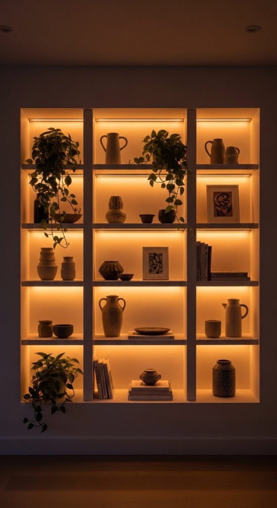 Backlighting open shelves makes even simple decor look curated. Mount the strip along the back wall inside the shelf, facing outward. The light creates a halo effect behind each displayed object. Warm amber or burnt orange works for rustic or bohemian rooms. Soft white suits minimalist and modern spaces. The strip is hidden from view — you only see the glow behind your items. This is one of the easiest living room upgrades you can do in under 30 minutes.