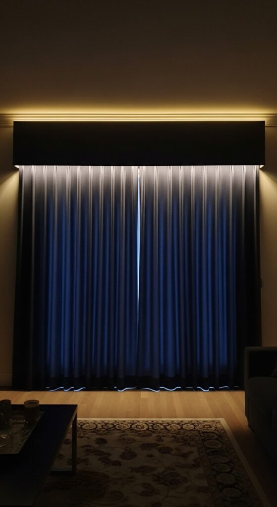 Curtain lighting is a theatrical touch that most people overlook. Mount an LED strip behind the valance or along the top of the curtain rod. The light spills down the fabric in a soft, dramatic wash. Choose warm white for an elegant look or color strips for something bolder. This technique works especially well with floor-to-ceiling curtains in living rooms or bedrooms. The strip hides completely behind the valance — you just see the beautiful glow along the curtain fabric below.