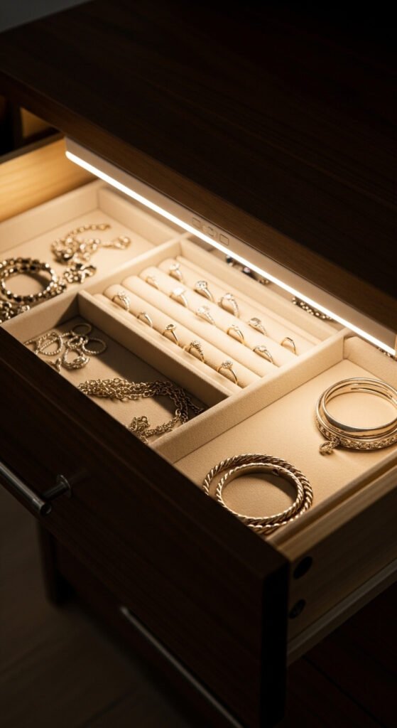 Illuminate your accessories with drawer lighting. A battery-powered LED strip mounted inside the front lip of a drawer turns any accessory drawer into a display case. When you open the drawer, the light turns on — either by motion sensor or a simple switch mechanism. This is practical for jewelry, watches, or any small items that are hard to see in a dark drawer. Battery packs keep this completely wire-free. Total cost: under $12 for most drawer sizes.