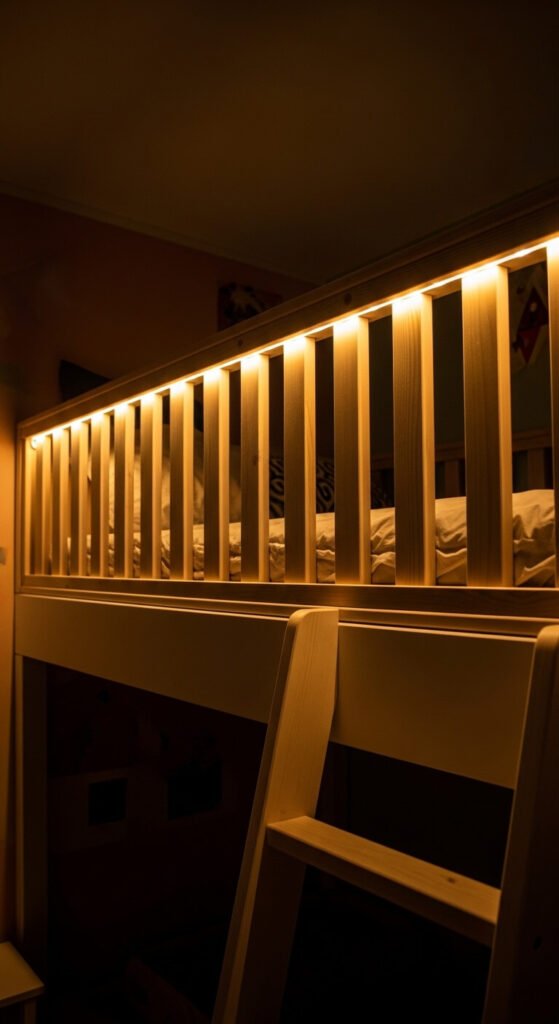 Loft beds are already a kid’s favorite thing. LED strips along the railing make it feel like a glowing fort. Use warm white or soft amber for a cozy sleep-friendly atmosphere. Soft color strips (low saturation pinks or blues) are popular with older kids. Mount the strip on the inner face of the railing so it shines inward into the sleeping nook. Keep all cords safely secured and out of reach. A simple on/off remote makes it easy for kids to manage themselves at bedtime.