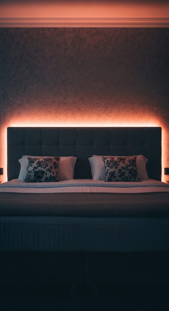 A backlit headboard feels instantly luxurious. It gives your bedroom that boutique hotel vibe without spending hundreds. Stick an LED strip along the back edge of your headboard so it shines against the wall. Warm pink, soft gold, or deep amber tones work well for relaxation. If your headboard isn’t attached to the wall, use command strips to hold the strip in place. Pair it with a smart plug so you can turn it off without getting up.