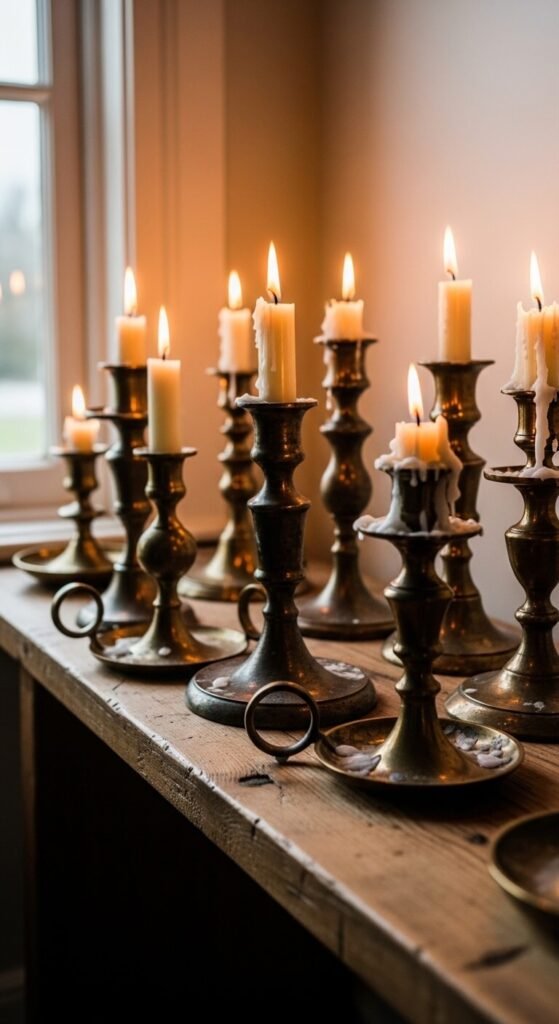 Shiny, polished brass is out. Aged, patinated brass is in. The darkening and dullness that comes with time gives metal character. Look for vintage brass candleholders, aged iron hooks, or weathered copper planters at thrift stores and antique markets. Do not clean them aggressively — let the patina stay. If you want to speed up aging on new metals, vinegar and salt work well as a DIY solution. The worn look is the finished look.