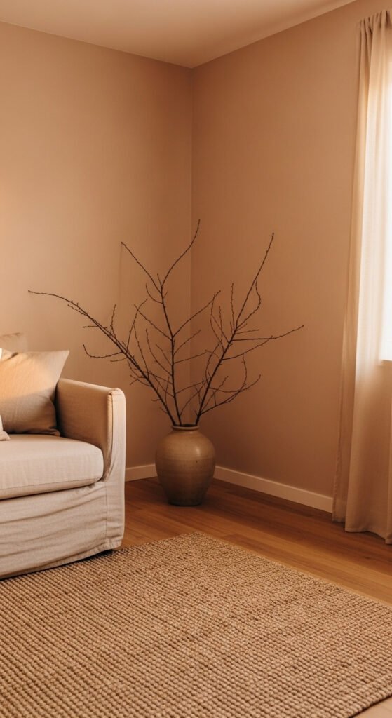 Wabi-sabi is not white walls with grey accents. The palette runs earthy and warm — clay, umber, sand, moss, slate, bark. These colors do not shout. They settle. Choose one warm earth tone for your walls and build around it. Add a deeper tone on trim or in textiles. These colors age well and photograph quietly. Look for color samples in the brown and muted green families. Benjamin Moore’s “Pale Oak” or “Clay Beige” are good starting points.