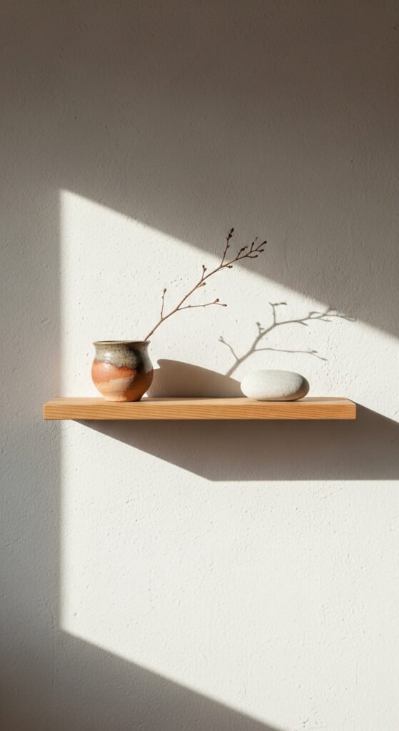Empty space is part of the design. Western shelving tends to be crowded and layered. Wabi-sabi shelving breathes. Take everything off one shelf. Put back only three items maximum. Space them out with intention. Odd numbers work best — one, three, or five objects per surface. The gaps between objects are just as important as the objects themselves. You will be surprised how much calmer a room feels with just a few honest things on display.