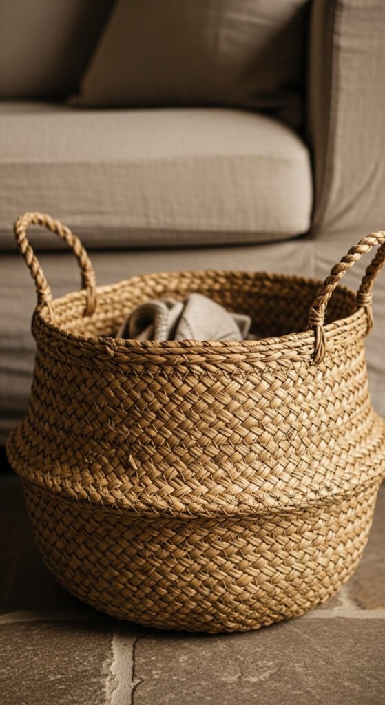 Woven baskets are functional and beautiful — and they get better with use. Use them to store blankets, hold towels, carry firewood, or simply sit empty on the floor. Look for natural materials: seagrass, water hyacinth, rattan, or jute. Thrift stores often have them for a few dollars. Avoid baskets with painted patterns or plastic fibers. The raw, imperfect weave is what gives them their warmth. Small baskets also work well as planters.