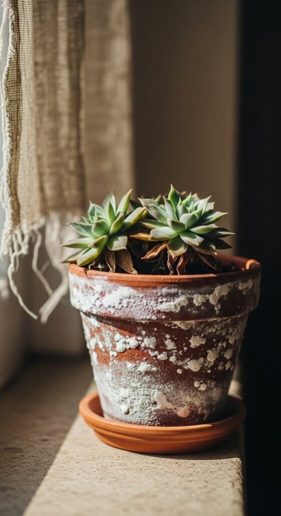 Perfect plants are not the wabi-sabi way. A slightly weathered succulent, a cactus with a lean, a trailing vine that is a little leggy — these are honest plants. Stop trying to make every plant perfectly full and symmetrical. Let some dry down, lean naturally, and age. Aged terracotta pots with calcium rings and rust stains are ideal containers. The plant and pot age together, and that gradual change is something worth watching.