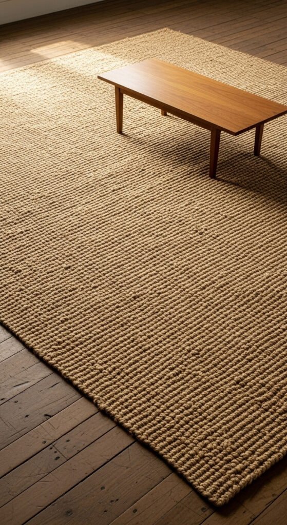 Bright, patterned rugs compete for attention. Natural fiber rugs — jute, sisal, seagrass, undyed wool — quietly anchor a room. They do not need to match anything because they match everything. They also age with grace, fading gently and softening underfoot. A basic jute rug from IKEA or Amazon starts around $40. Layer a smaller vintage rug on top for texture without overwhelming the space. Keep the pattern minimal or absent entirely.