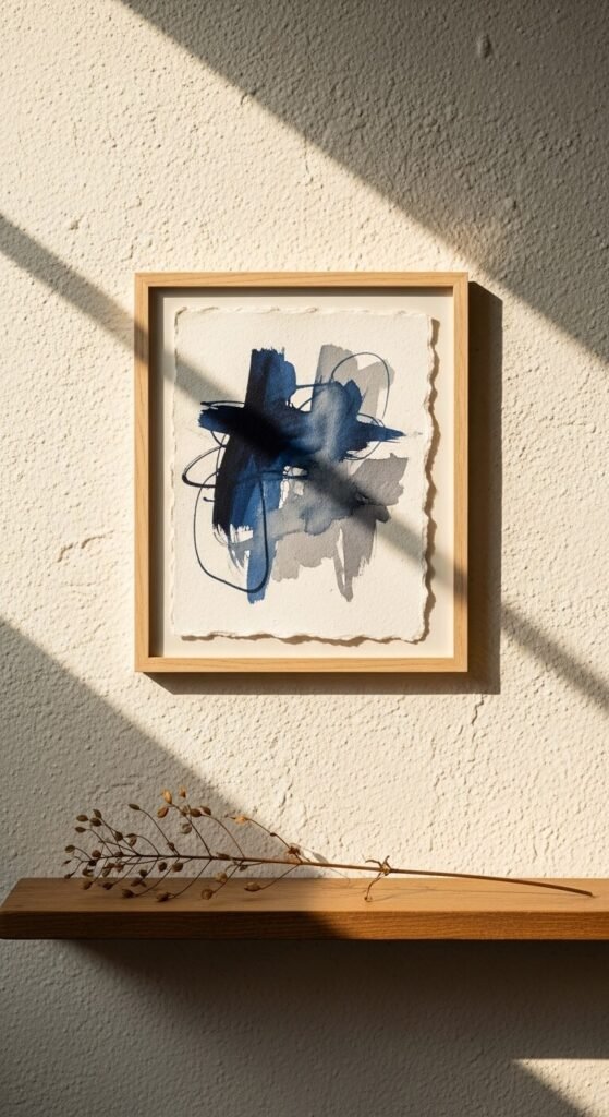 Art does not need to be expensive or perfect. Make your own. Take a piece of watercolor paper and paint one loose brushstroke in black ink. Let it dry, trim loosely, and frame it. That is art. You can also press flowers between book pages for a week, then frame the dried result. Simple, handmade, honest pieces work far better in a wabi-sabi space than framed prints from a big-box store. The imperfections in the paper and brushwork are features.