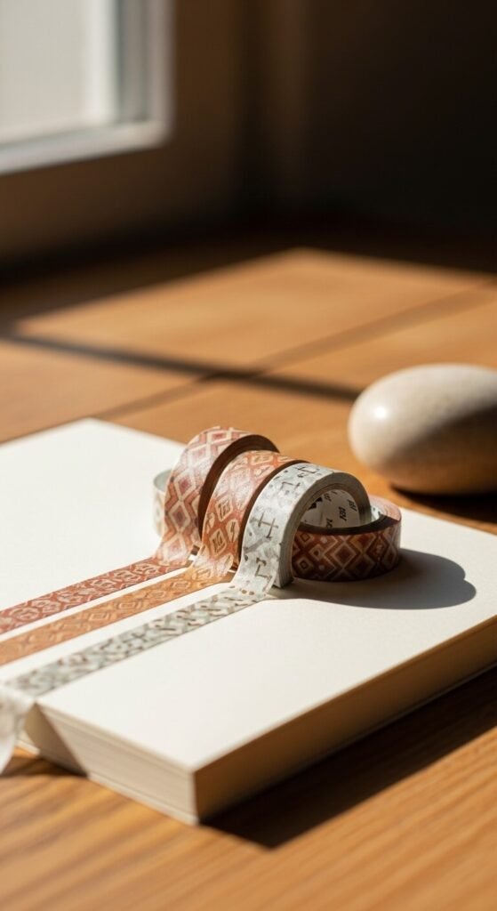 Washi tape is a Japanese masking tape with beautiful textures and muted patterns. It is temporary, affordable, and genuinely wabi-sabi in spirit. Use it to frame a piece of paper art on a wall. Mark a shelf edge with a strip of earthy patterned tape. Patch a slight tear on a lampshade. It costs under $5 a roll and works on almost any surface. Because it is temporary, it encourages you to keep changing things — which is the wabi-sabi spirit in action.