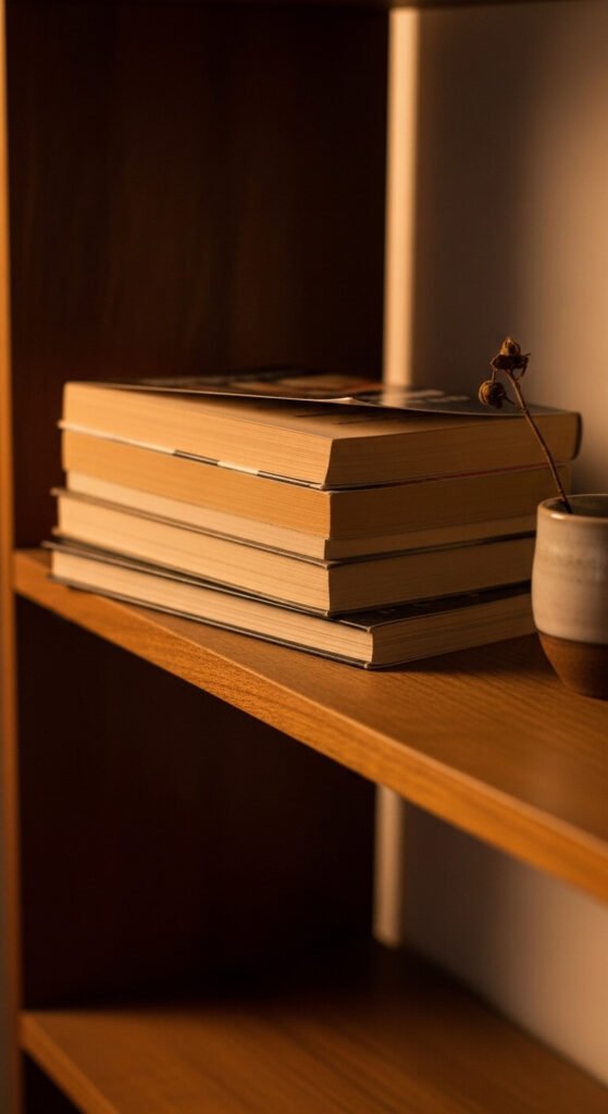 Stop hiding your most-loved books because their spines are worn. A creased spine, a dog-eared page, a faded cover — these are beautiful. Display the books you have actually read, with all their wear showing. Stack a few horizontally on a shelf with an object on top. Line them up without forcing them into a perfect row. Wabi-sabi bookshelves feel lived-in because they are. Your books carry your history. Let them show it.