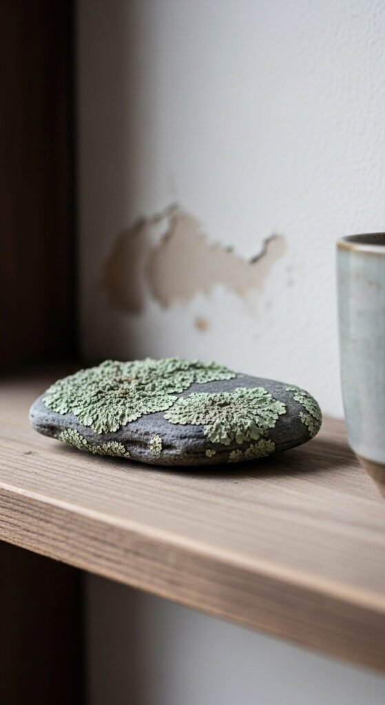 Moss and lichen are free, living textures. Collect a piece of bark covered in lichen from a fallen branch. Place a clump of preserved moss in a shallow dish. Make a small moss terrarium in an old glass jar with no lid. Preserved sheet moss (available cheaply online) lasts for years without watering and looks incredible in wabi-sabi spaces. Green, grey-green, and silver-green tones add life to a shelf without the maintenance of a traditional houseplant.