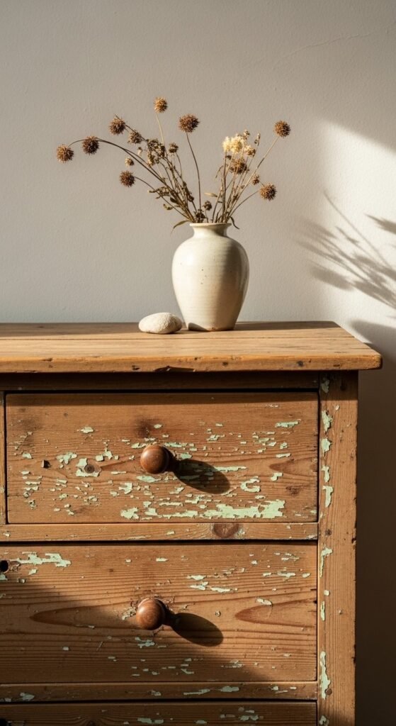 Second-hand furniture is the most wabi-sabi furniture you can buy. It arrives already imperfect, already aged, already carrying a story. Look at estate sales, Facebook Marketplace, and thrift shops. Do not sand away the patina or repaint in white. Let the worn layers stay. A dresser with chipped paint is more interesting than a new one. A table with water rings has history. Buying second-hand also costs a fraction of new furniture. The imperfections are not problems — they are provenance.