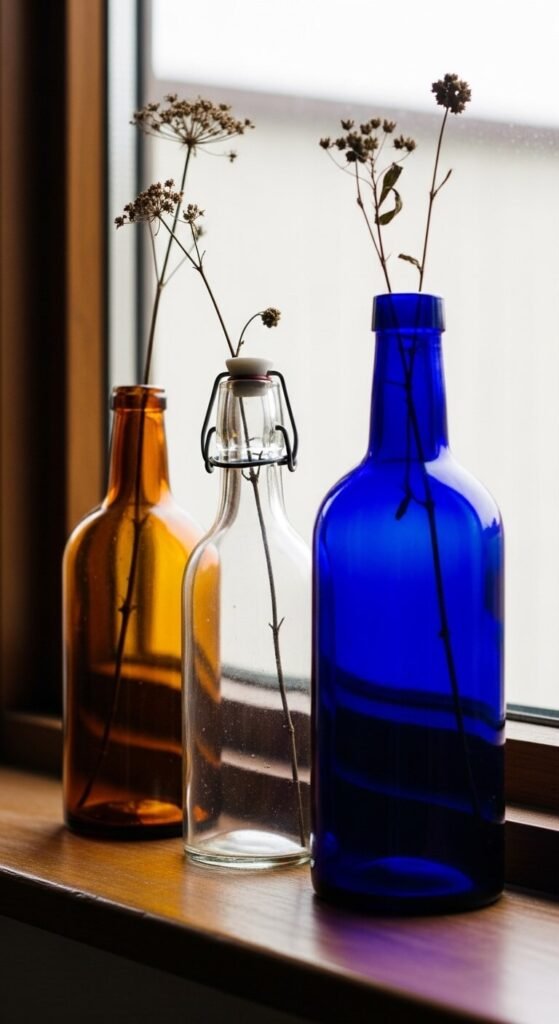 Old bottles are perfect wabi-sabi vases. Amber pharmacy bottles, green wine bottles, clear old milk bottles, dark beer bottles — each one already has character. Collect them, clean them, and use them to hold a single dried stem or fresh flower. A cluster of different-sized bottles on a windowsill is one of the easiest and most beautiful wabi-sabi displays you can create. They cost nothing and improve every time the light changes around them.