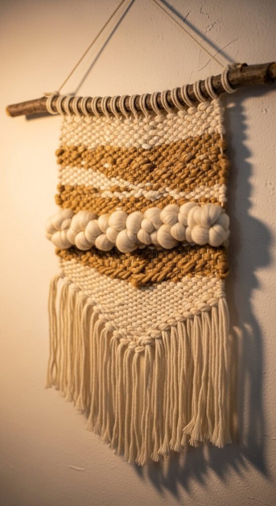 Textile wall hangings are one of the most accessible wabi-sabi DIY projects. You need a stick, some yarn, and a basic loom or even just your fingers. Beginner weaving is easy to learn from YouTube. Use natural, undyed fibers — cotton, wool, linen, jute. The imperfections in your weaving are not mistakes. They are exactly what makes it art. Finished pieces cost about $10 in materials and look extraordinary on a bare plaster wall.
